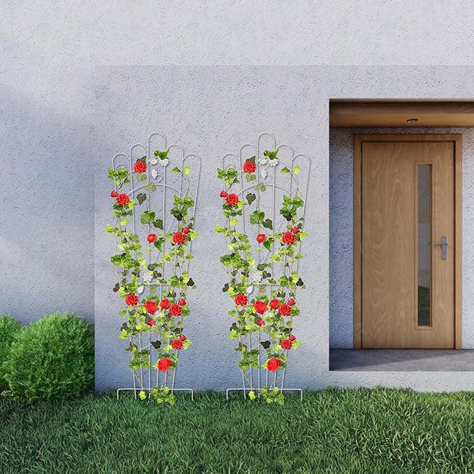 - MULTI-PURPOSE PLANT SUPPORT: More plants can be displayed using a plant trellis, including climbing roses, cucumber vines, ivy, clematis, morning glory, grapes, and potted vegetables with long stems, among other things. Trellis for outdoor climbing plants can also be used as a barrier to enhancing the appearance of your home or yard.