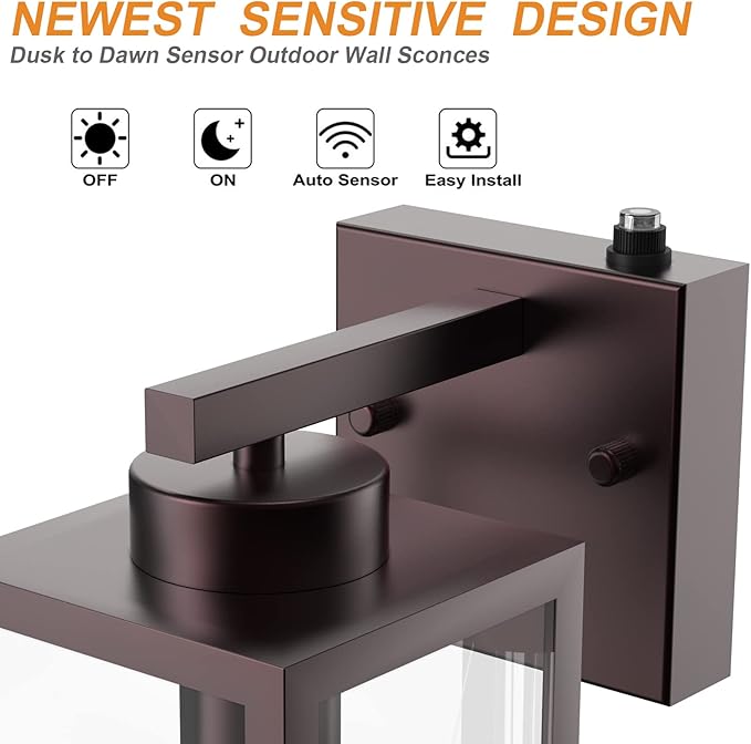 - 【Top-notch Photocell Sensor Technology】Take the upgraded photocell sensor, our outdoor wall light fixtures can sensitively detect the brightness of the surroundings to adjust the switch. Auto turn on at night time when ambient brightness less than 20 LUX, auto turn off at daytime when brightness over 100 LUX. You don't need to turn it on/off manually, free your hands, and save your bills on electricity.