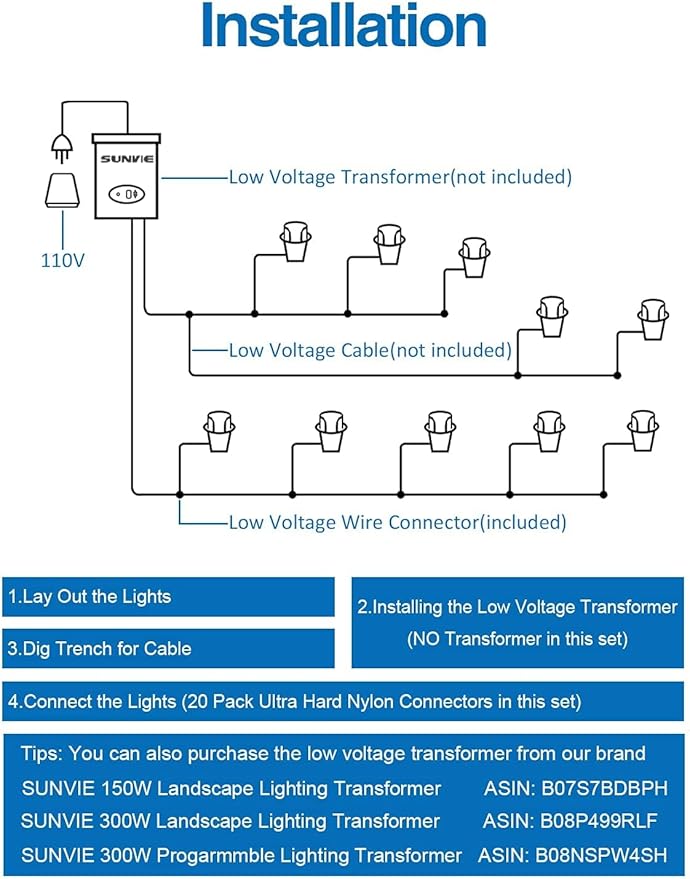 - 【Safe and Easy to install】12-24V input voltage, compatible with most low voltage landscape lighting transformers. Including 16 unique SUNVIE screw tight designed low voltage wire connector. Easier and safer to install and use. (Transformer required to convert 110V to 12V-24V, not included)