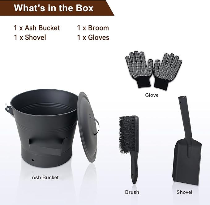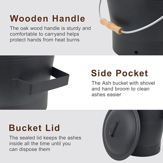 - All in one bucket set - the ash bucket comes with a shovel, cute lid, and a wooden broom to help you keep your fireplace tidy. It’s also fitted with wooden handles for perfect grip; easily carry the ash bucket by its sturdy metal handle. The raised bottom keeps the bucket away from the ground, thus protecting the floor from heat.