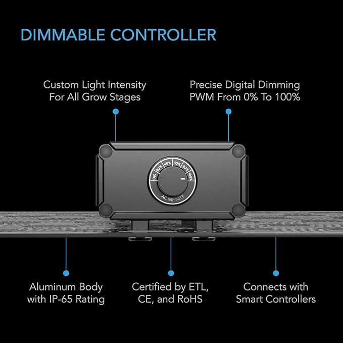 - Dimmer enables 0 to 100% brightness. Can connect with our smart controllers to access grow cycles, scheduling, and app.