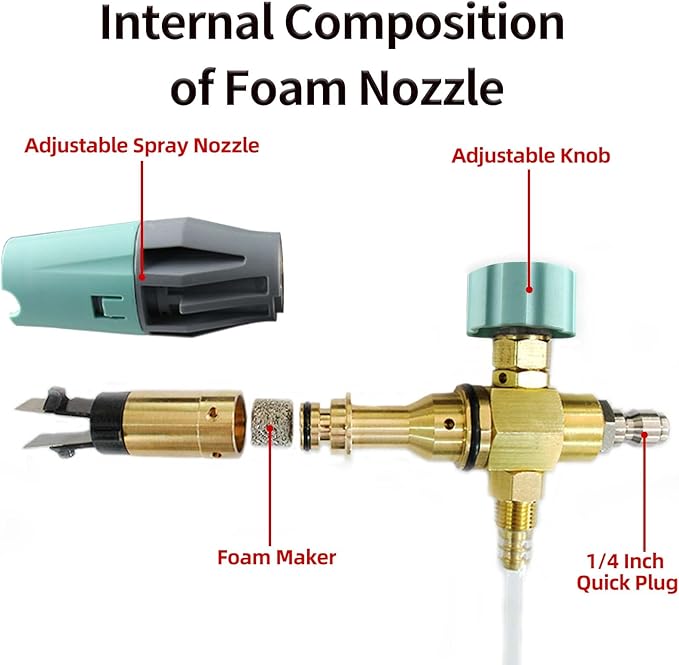 - 【Easy to Use】Equipped with 1/4 inch quick connect accessories, which can be connected to a high pressure washer gun or extension wand, adjust the knob to achieve the required foam level, and adjust the adjustable nozzle to change the spray width and angle as needed.