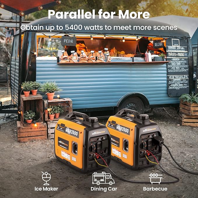 - [Versatile Power Supply] With 3500 peak watts and 3000 running watts, our generator can easily power a small house, RV, food truck, and more. It is the ideal product for home backup power under extreme weather. And its compact and lightweight design (47lbs) makes it perfect for outdoor living and travel.