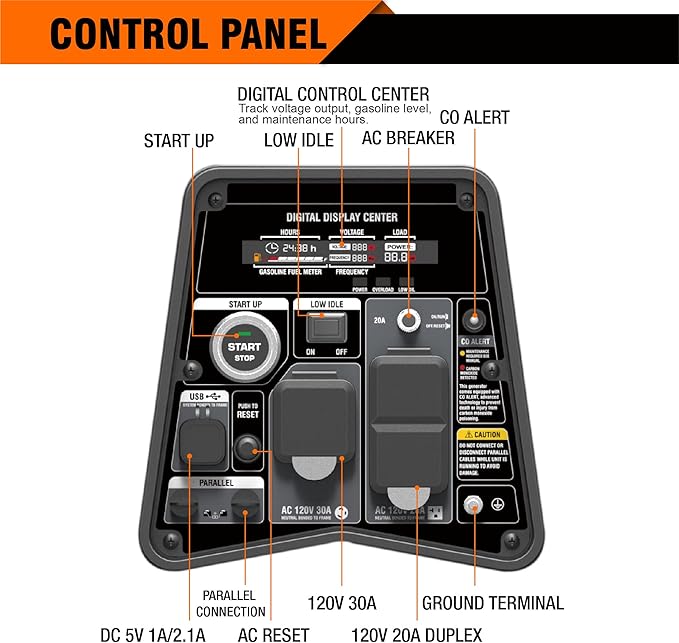 - 【EASY TO CARRY AND USE】 1 telescopic rod and 2 rolling wheels for easy travel; At only 56.2 pounds, Light weight and compact design; 5 in 1 Digital Data Center(Hours, Voltage, Loading,Gas fuel meter, Frequency) ,Remote Start With Key Fob.