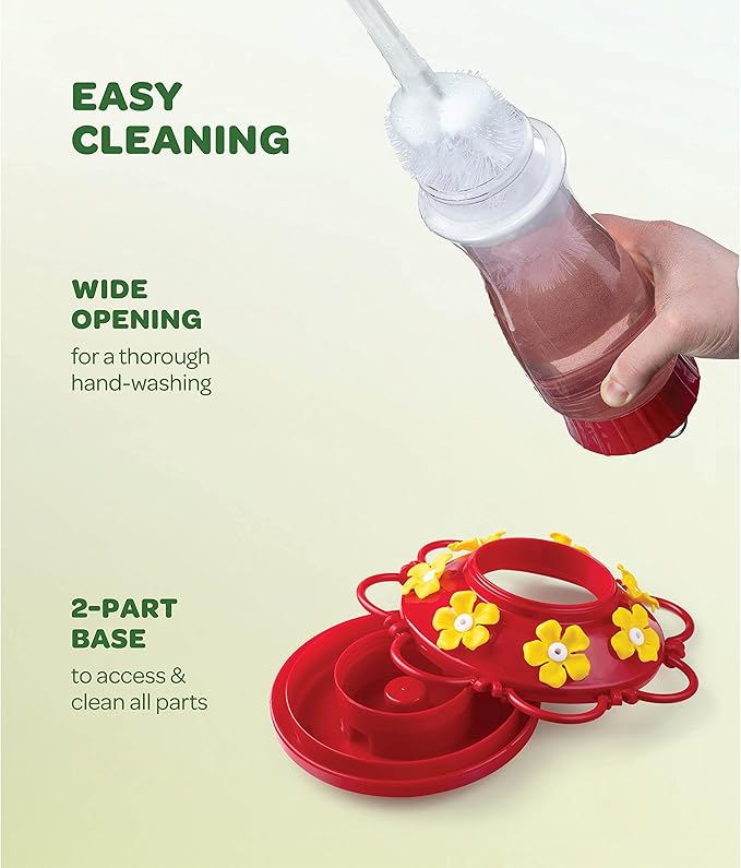- ERGONOMIC DESIGN: The wide mouth ensures easy cleaning and filling, and the 2-part base easily twists apart for an effortlessly thorough cleaning job. Of clear hard plastic, you can monitor nectar levels so you always know when to refill. Hand-wash only; Not dishwasher safe.
