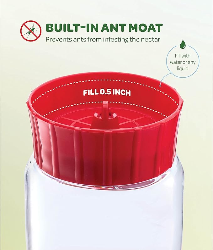 - ANT GUARD FOR HUMMINGBIRD FEEDERS: An ant moat is attached to the top of the feeder to repel ants. Fill it with water and drive away any approaching bugs. Ensure the nectar you prepared for the hummingbirds is pure and free of any creepy-crawlies.