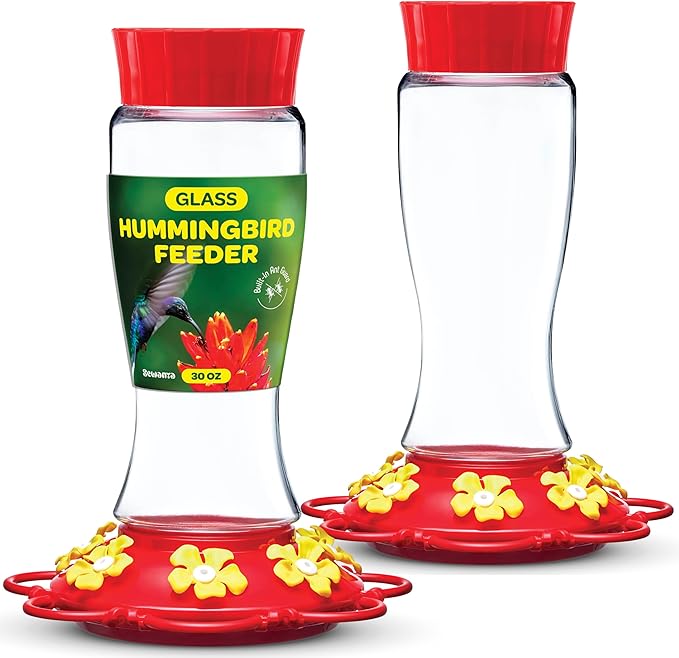 Hummingbird Feeder 30 oz [Set of 2] Glass Hummingbird Feeders for Outdoors - with Built-in Ant Guard - Circular Perch with 7 Feeding Ports - Wide Mouth for Easy Filling/2 Part Base for Easy Cleaning