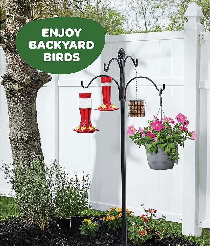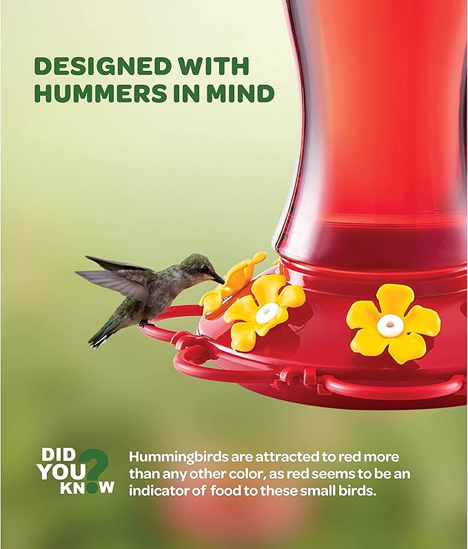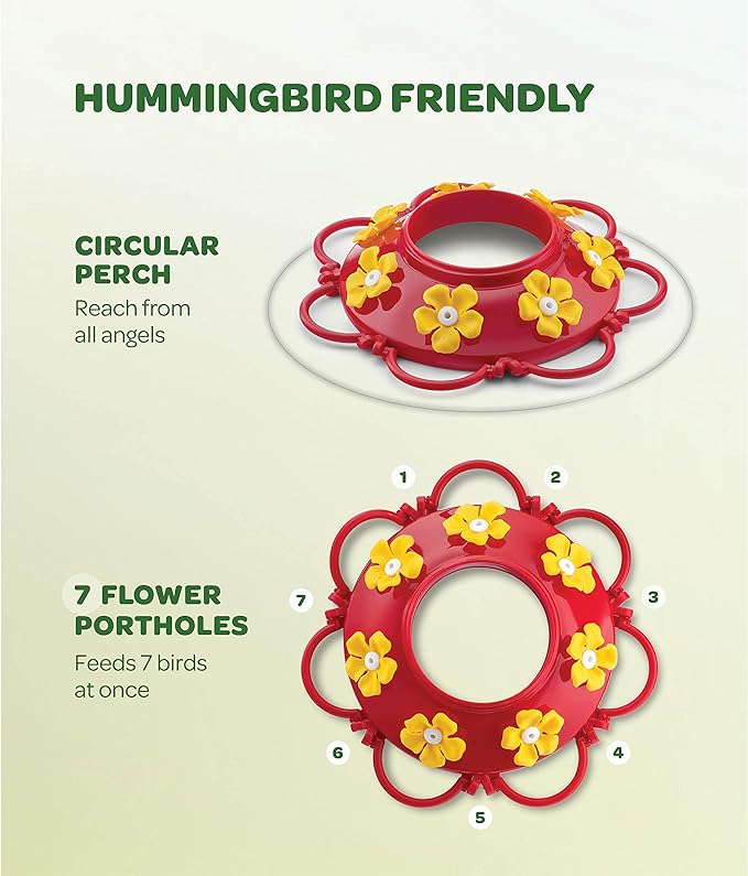 - ATTRACTIVE FEEDER: 10 ounces of nectar in this bright red hummingbird feeder attract multitudes of hummingbirds to your backyard. 5 flower-shaped feeding ports and perches are arranged in a circular manner for several birds to feed at once.