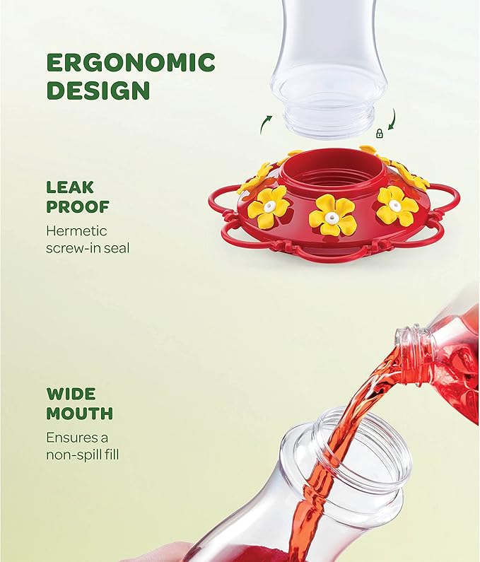- LEAKPROOF RESERVOIR: The mouth of the reservoir tightly screws onto the base, effectively sealing the bird feeder. After filling the container and screwing it onto the base, flip it over; the feeder will not leak even while upside down.