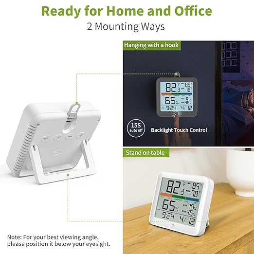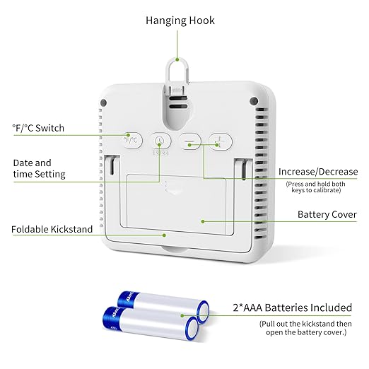 - Two Mounting Options – With a kickstand to sit it on a table as a humidity meter, and a hook to hang on the wall as a temperature monitor. Powered by 2 x AAA batteries (included). Temperature unit °F/°C selectable and Time Format 12H/24H selectable