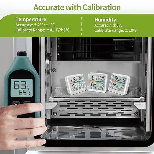 - Accurate with Calibration - MeesMeek thermometer and hygrometer combo device has built-in advanced sensors which is pre-calibrated at the factory with accuracy of +- 2 °F and +- 3% RH, and it also has a calibrate function that allows you to calibrate it at any time for more accurate and reliable readings