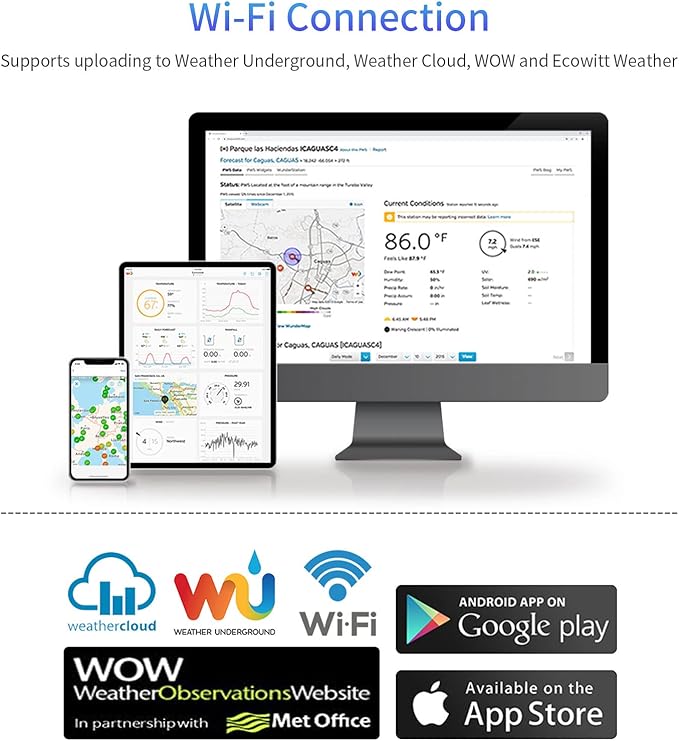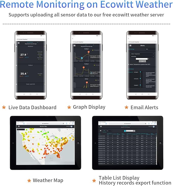 - 【Uploading to Ecowitt Weather Server】: Supports uploading to our free Ecowitt weather server(ecowitt.net) to view the soil moisture data graph and download the history records on the website; support setting and receiving email alerts from the server; channel names can be edited on the website; supports remote monitoring with smart phone, laptop, or computer by visiting the website.