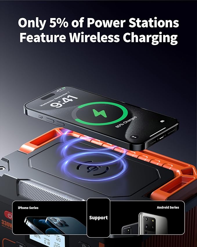 - 【Up to 9 Simultaneous Devices】: Featuring 3* DC outlet, 3* fast charge 3.0 port, 1* AC outlet, 1* PD 60W USB-C port and 1*Wireless Charging for phone. Also including SOS LED bright light. It can meet all you meets and power your smartphone, tablet, laptop, camera, light, drones, fans, in-car appliances, CPAP machine anytime anywhere.