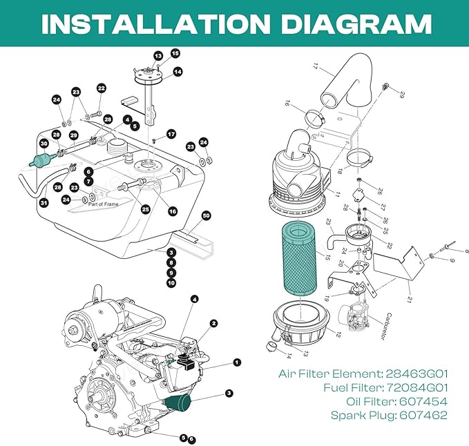 - Replacement ez go gas golf cart tune up kit part numbers: Air filter element 28463G01 28463-G01, fuel filter 72084G01 72084-G01, oil filter 607454, spark plug 607462