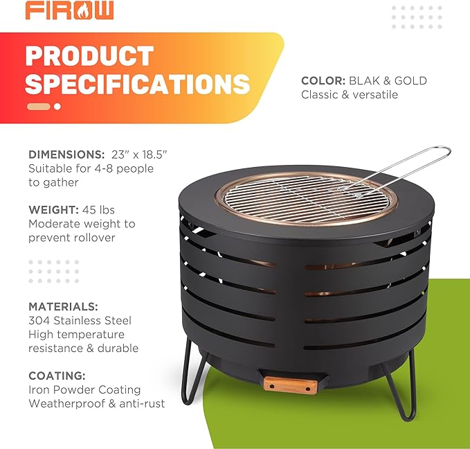 - 【AFTER-SALES & PRECAUTIONS】FIROW brand provides online service within 12 hours and 12-month warranty service. It should be noted that in order to increase the service life of the stove, we recommend natural cooling instead of extinguishing the fire with water. Do not use on lawns, wooden decks, faux wood or asphalt.