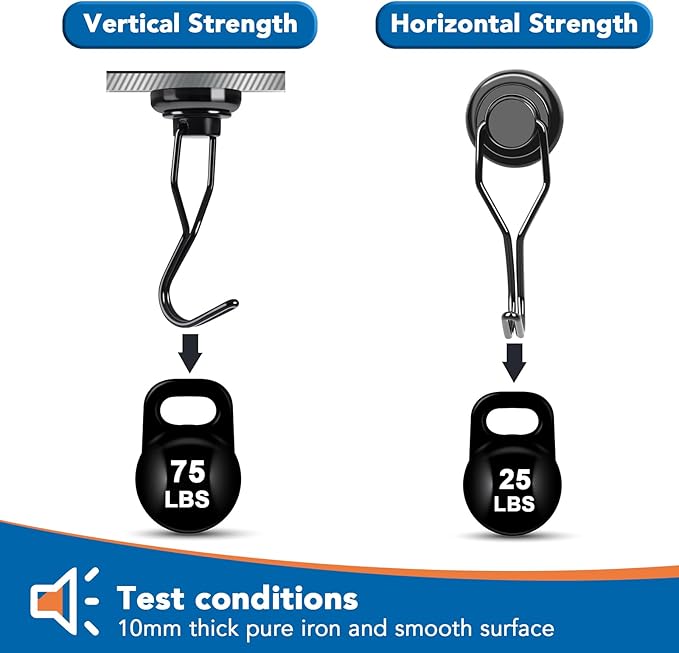 - 【 High Quality 】 The rotating swing magnetic hook heavy duty has a pulling force of 75 pounds and is based on horizontal applications - reducing by 2/3 if used vertically. The magnetic hook features a heavy and stable magnetic surface, with strong magnetism lasting forever!