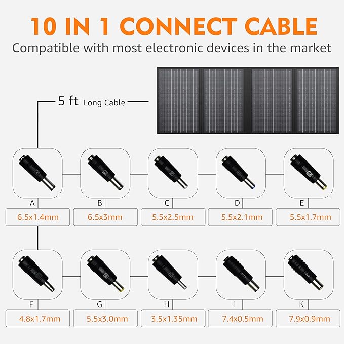 - 【Compatible with Most Solar Generators】The 60W foldable solar panel equipped with 10*DC Connectors, compatible with most portable power stations/solar generators on the market.