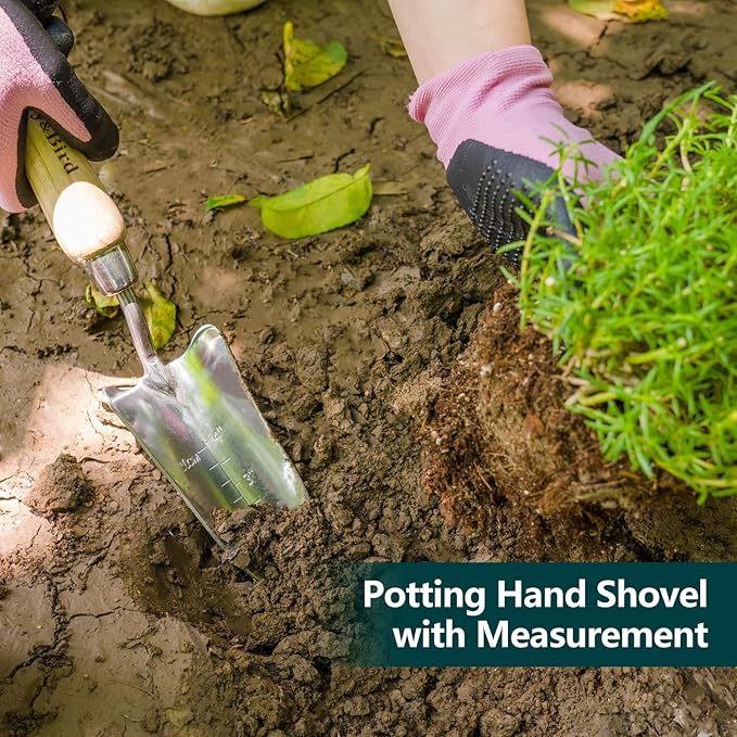 - Versatility. This gardening tool set can help you with a variety of gardening. The hand shovel helps you transplant, shovel soil, compost, and more. You can use the hand fork to aerate and loosen the soil. The transplanter has a long, thin head for easy transplanting. Clear depth markings allow you to measure soil depth in inches or centimeters to ensure that seeds, bulbs, and small plants are set at the correct depth. Gardening is easy with the Berry&Bird Classic Gardening Tool Set!