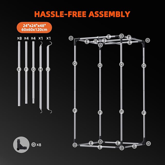 - TOOL-FREE SETUP IN MINUTES: Connect the metal frame to the corner adapter, pull the tent on, add the floor tray and hanging bars, and start growing faster with ultra-stable construction