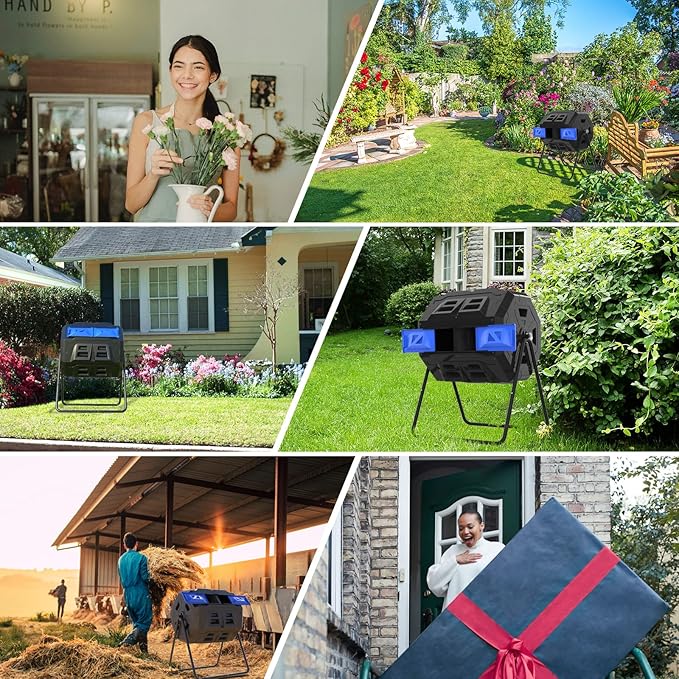 - 🌱Tumbler design: The compost tumbler design just need you to rotate it slightly without having to dig, turn, and mix by hand.Only need to open the sliding door and put the scraps into it and rotate it 6-7 times every few days.