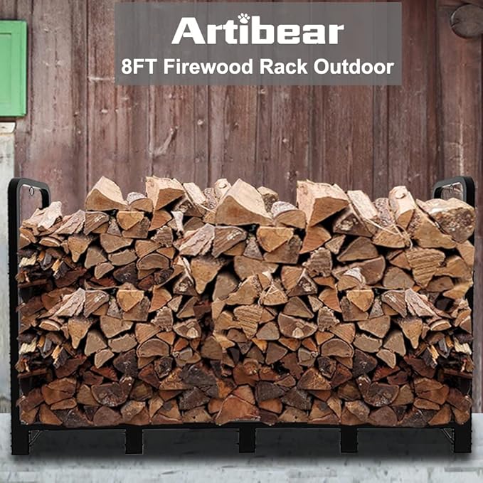 Artibear 8ft Outdoor Firewood Rack, Upgraded Heavy Duty Logs Stand Stacker Holder for Fireplace - Metal Lumber Storage Carrier Organizer, Bright Black