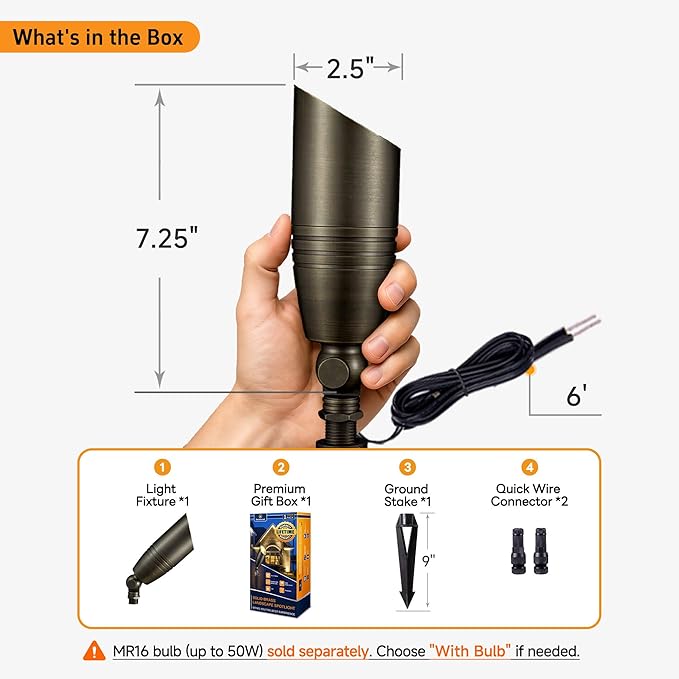 - ๐๐ซ๐ข๐ ๐ก๐ญ: Outdoor spotlights that use MR16 LED bulbs (sold separately) and support up to 50W for powerful illumination. Lights up exterior trees, walls, flags, and fountains. 180ยฐ adjustable while the ground stake stays in place