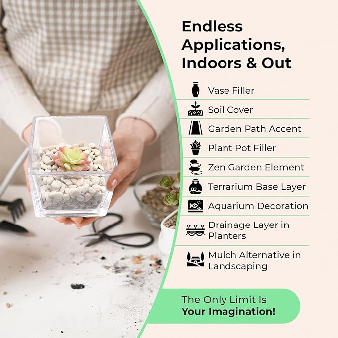 - Styles for Use Indoors and Outdoors: We've got the perfect pebble for every project: coarse decorative sand, small rocks for plants, aquarium gravel, landscape rocks, garden stones, pot filler, pebbles for vases, soil cover, and more