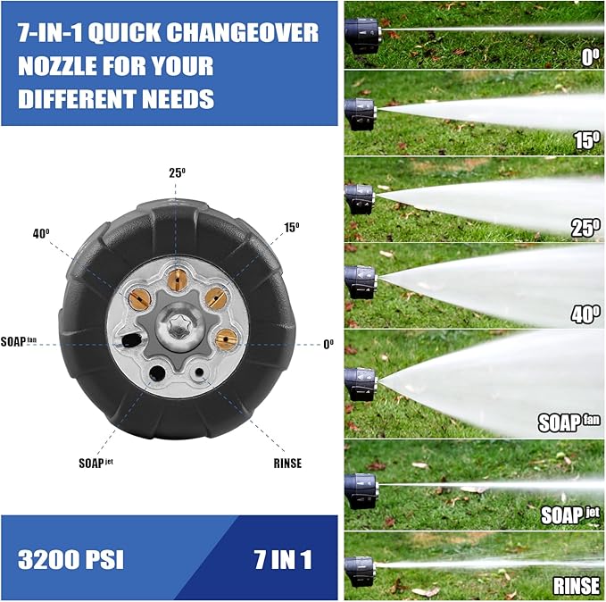 - NOT 6 BUT 7: Instead of one, our 7-in-1 pressure washer nozzle has two soap patterns: soap fan + soap jet. Soap fan pattern creates thicker foam while cleaning the car, soap jet pattern is great for cleaning gap. MEKOH spray nozzle comes with seven quick changeover spray patterns: 0, 15, 25, 40 Degree, Rinse, Soap Fan, Soap Jet, working flawlessly in different cleaning applications. We are proud to say that our adjustable pressure washer nozzle is smaller, lighter and more efficient than others