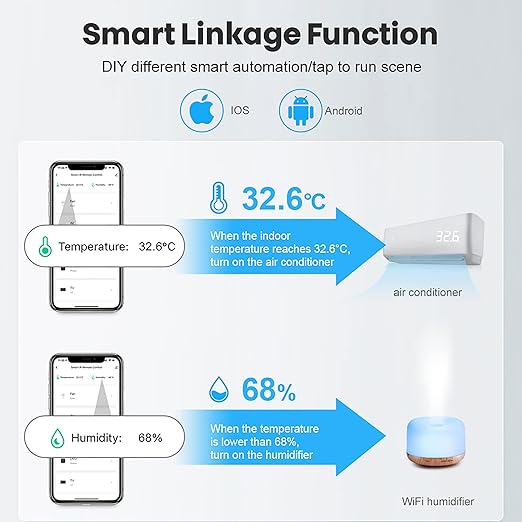 - Realize automation: Use 2.4G wi-fi network, easy to set up wifi, auto scan device and add after turn on Bluetooth via Tuya app. The Smart hygrometer thermometer monitor sensor can be used as the temperature and humidity data source of Tuya Smart, Smart Life, Amazon Alexa, and Google Home. You can do many automated processes based on the data source.