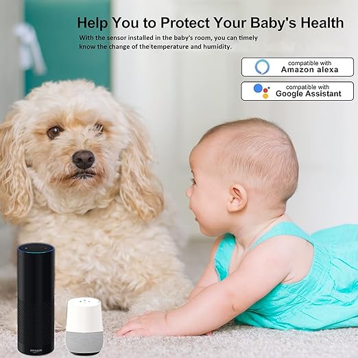 - Remotely View temperature humidity: The temperature and humidity sensor can be viewed remotely, you can monitor your baby's room, wine cellar, garage with this item. Support Alexa, and Google Assistant, know temperature via simple voice control commands, e.g.: "Alexa, What's the temperature in here?"