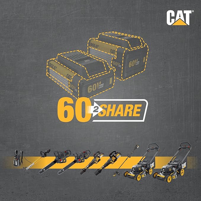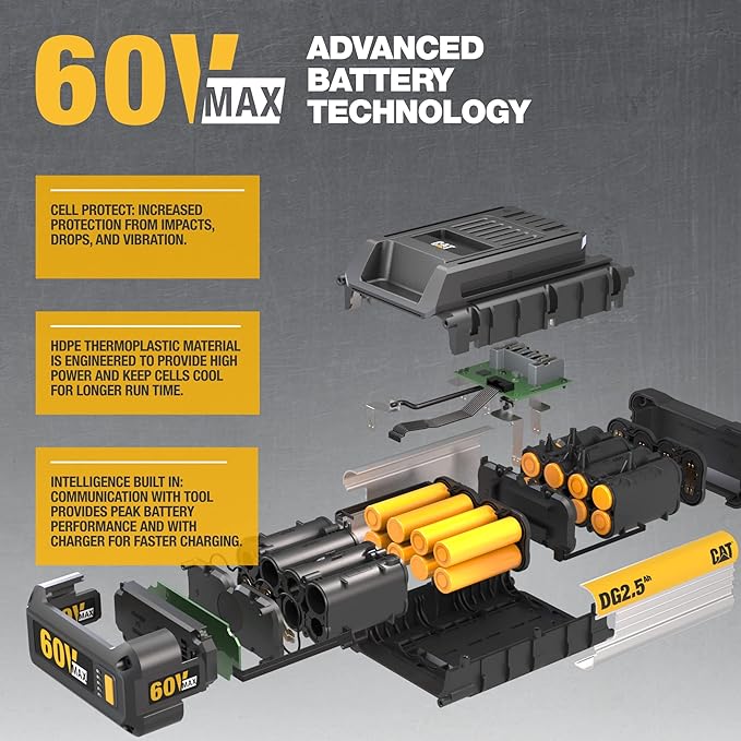 - ONE BATTERY, ENDLESS EQUIPMENT: Battery and Charger sold separately. Cat 60V batteries are compatible with the entire Cat 60V OPE product line. Cat 60V batteries are shielded from impact, water, and heat to optimize power, runtime, and cell life