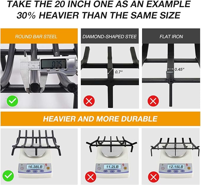 - [Thickned Round Steel] Firewood grates is made of 3/4" round bar steel. Compare with the diamond-shaped steel or flat iron fireplace log holder, it is heavy duty and more durable. No assemble need, very convenient.