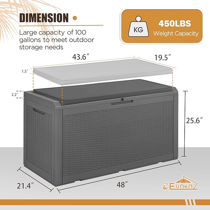 - Large Storage Space: Devoko storage box has a total of 100 gallons of internal storage space with dimensions: 48"*25.6"*21.4", which can be used to store any indoor or outdoor items, such as yoga mats and Cleaning Supplies
