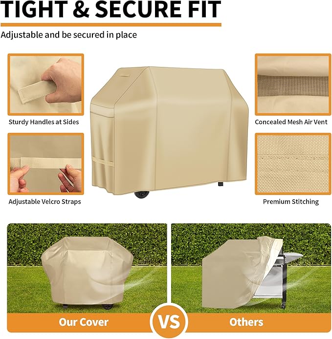- 【Handles & Straps & Covered Air Vents】: The upgraded grill cover is designed with concealed air vent, 2 handles and adjustable 2 straps. Concealed air vent design can keep your grill dry well. Handles and straps are convenient to hold the grill and grill cover tightly together - Prevent your cover from blowing off.