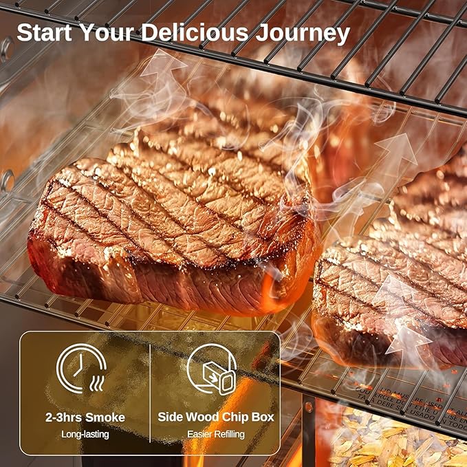 - ๐๐ฒ๐๐๐ฒ๐ฟ ๐ฆ๐บ๐ผ๐ธ๐ฒ๐ฟ ๐๐น๐ฎ๐๐ผ๐ฟ: The smoker features a side wood chip loader for continuous smoking for 2-3 hours without opening the door and adding chips, preserving the internal heat, and locking in the smoked flavors