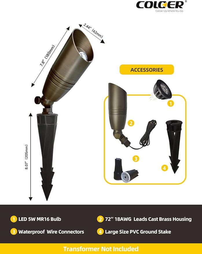 - Replaceable Bulb: The COLOER bronze landscape spotlight uses a design with separate light fixture and bulb, which offers a longer lifespan compared to the non-detachable integrated design. You can replace the bulb without having to replace the entire fixture just because the bulb is broken. COLOER landscape lighting offers a lifetime warranty on the light fixture(painted finish is 10 years) and a 5 years for the LED bulb.