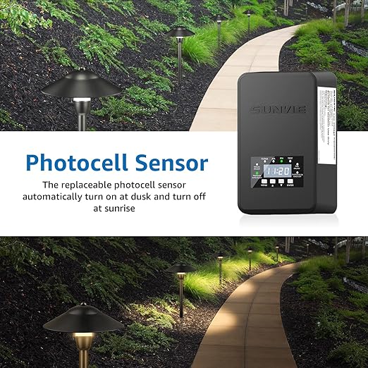 - DUSK TO DAWN PHOTOCELL SENSOR - Equipped with removable and replaceable photocell sensors, the outdoor landscape transformer automatically turns on at dusk and turns off at sunrise. The lighting transformer comes with 6ft UL listed power cord and 6.8ft UL listed sensor power cord which can be installed indoors or outdoors wherever you want.