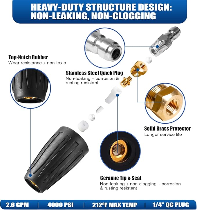- SUPERB QUALITY, RELIABLE INVEST: No one want a tool to break so often, especially in power washing. MEKOH power washer turbo nozzle is definitely top-notch. Build by stainless steel, solid brass, premium ceramic and durable rubber coating, we are proud to say MEKOH rotating nozzle is non-leaking, non-clogging and non-rusting. Each pressure washer nozzle is tested before selling, working great for most brand pressure washers, electric or gas-powered machines. Hot and cold water are both available