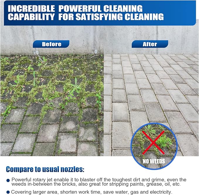 - A UNIVERSAL TOOL: Imagine how much work this small rotating nozzle can do, the powerful water strike enable it remove the dirt, grime and debris easily. Even the toughest rust, grease and oil can be removed in one sec. The spray also has enhanced paint removal capabilities for wood exteriors, effortlessly removes weeds between bricks, cleans lawn furniture, and scrubs away mud and clay from cars, boats, and construction equipment. It works like a breeze!