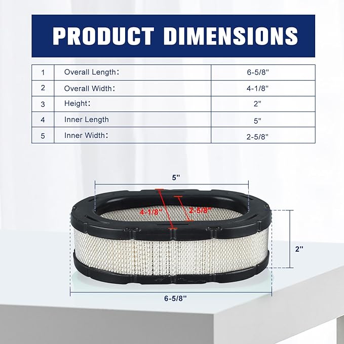 - [Dimensions For KH-32-883-09-S1 Kohler Air Filter]: Inner Length:5", Inner Width:2-5/8", Overall Length:6-5/8", Overall Width:4-1/8", Height:2"(Measurements do not include pre filter).