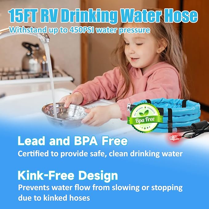 - 【Upgrade】Upgrade to a 5/8 inch RV water hose will provide a higher water flow rate than the 1/2 inch for all your RV water needs, and double protection with rubber washer and Teflon tape prevents leaks at hose thread, and thickened version of the water pipe material can withstand up to 450PSI water pressure. After rigorous laboratory testing, heated water hose for RV has strong cold resistance, ensuring that the water flows unimpeded in extreme cold winter.