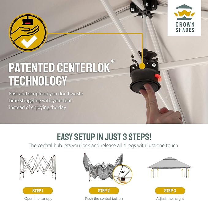 - [EASIEST SET UP]: Patented one push center lock technology – central hub locks out all four legs with a single push. Then use the soft pinch-free buttons to set the leg height. Next generation canopy designed so two people can set it up in seconds with no tools necessary.