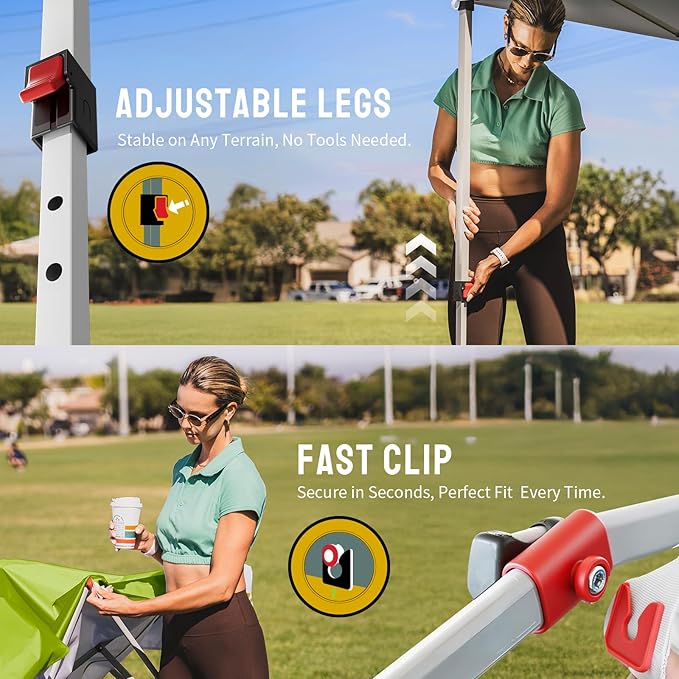 - FAST CLIP CANOPY FABRIC - The new clip system easily attaches the canopy fabric to the frame. The silver-coated interior provides UPF 50+ UV protection, ensuring cooler and safer shade. Made from rugged 150D fabric, the pop up tent is water-resistant and flame-resistant (CPAI-84). Integrated air vents and the Fast Clip system prevent wind lift and rain pooling, reducing fabric tearing risks. This innovative design is ideal for outdoor events and gatherings
