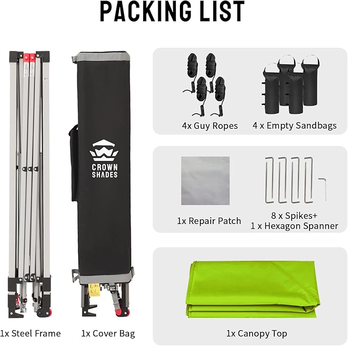 - STO’ N GO SYSTEM - Our lift-free system makes collapsing, storing, and transporting the 10x10 tent a breeze. The 10x10 popup canopy can be stored with the fabric attached, with a specialized pocket for 4 sandbags, 8 stakes, and 4 guy ropes. Integrated wheels in the feet allow easy movement even when the instant shelter tent is set up, by simply lifting the side without wheels. This feature is especially useful for quick setup and takedown at locations like the patio or sports events