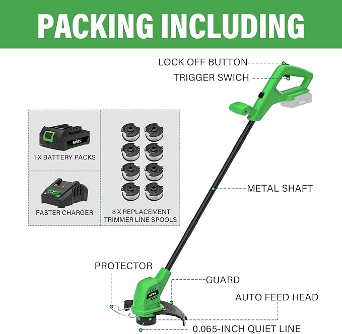 - 【Safety Protection Design】The weed wacker has a safety lock design to prevent accidental start. It also has adjustable edge guard, so you don't damage plants, landscape features, and lawn ornaments while you're trimming.