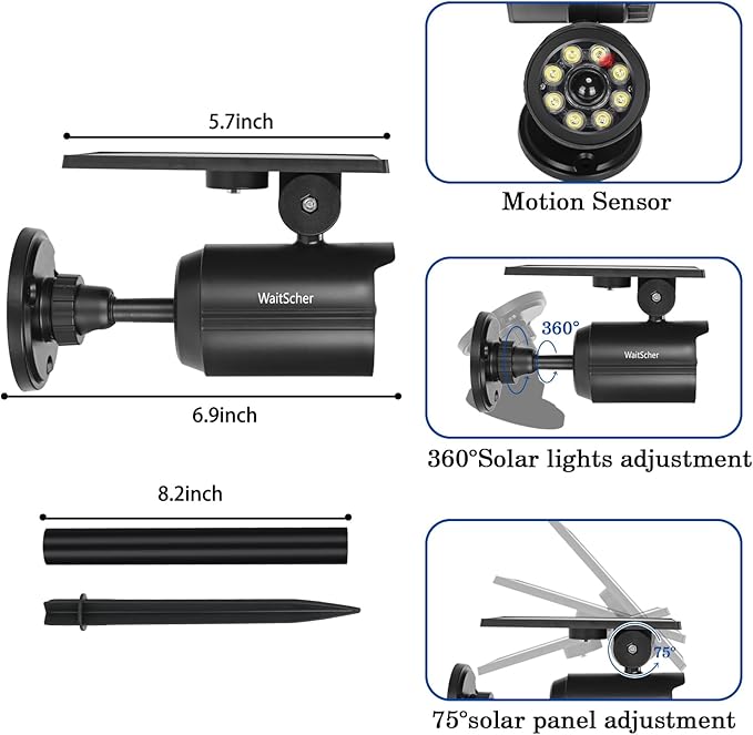 - Fake Security Camera with Solar Motion Lights: This solar motion lights outdoor shape imitates the shape of a bullet surveillance camera. A dummy camera with a red indicator light is almost as useful as a real one in deterring burglars and intruders but at a much lower cost( about 1β4 of a real security camera) providing secure illumination and protection for the dark corner of your house, especially for those who live alone