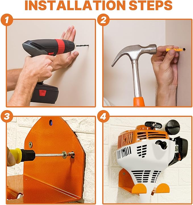 - Sturdy and Premium Materials: The weed eater hanger is made of thickened stainless steel, which is stronger and has high bearing capacity. The surface of the racks is sprayed with orange paint for double protection. Waterproof and anti-rust, resistance to chipping and cracking. Smooth edge cutting does not hurt your hands and tools