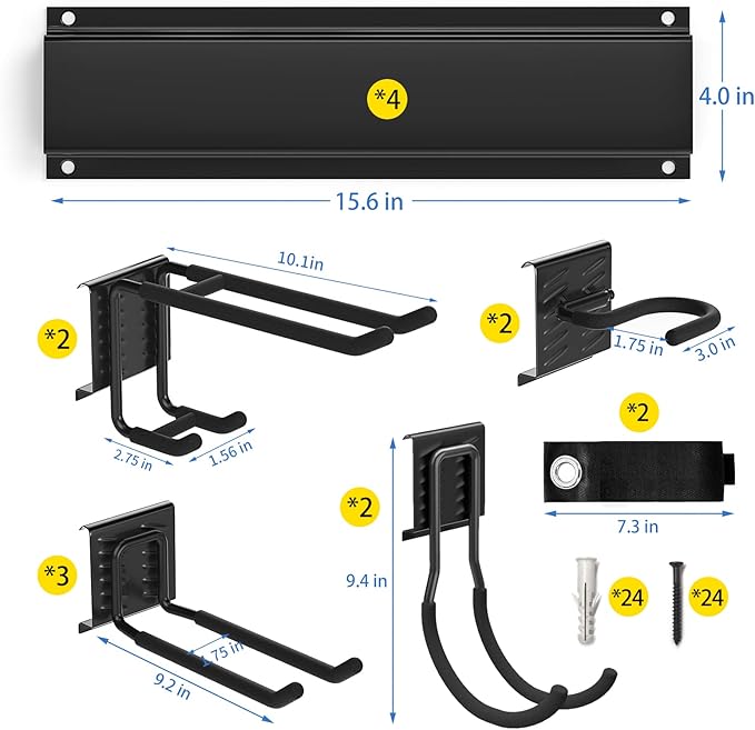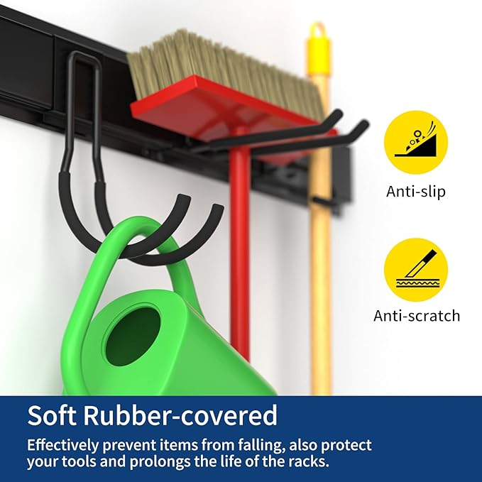 - 【Adjustable Rubber-coated Hooks】- The garage organizers and storage have 2 double layer hooks, 3 long hooks, 2 large J hooks, 2 broom hooks and and 2 extension straps are designed to fit all your needs. All the hooks wrapped in rubber to protect your tools from sliding and getting damaged.