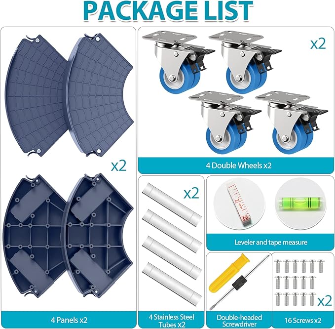 - 【EASY TO INSTALL】It only takes 4 steps to easily complete the assembly, which is very simple. The package includes instructions, 4 casters, 4 panels, 4 connecting tubes, a screwdriver, and some screws. In addition, we also provided an additional horizontal instrument (easy to distinguish uneven ground and better adjust the height of the product), and a tape measure (convenient for measuring the size of items to adjust the size of the plant caddy).