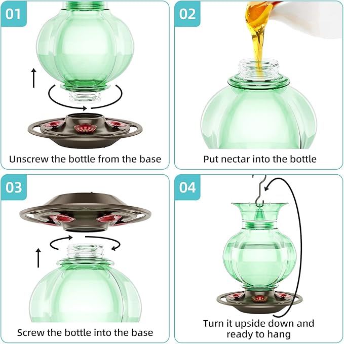 - Wide Mouth Bottle Design: this hummingbird feeders with super wide mouth bottle design is easy for filling and cleaning. There is no need to worry about being unable to clean the inside bottle and causing contamination of the newly filled nectar.